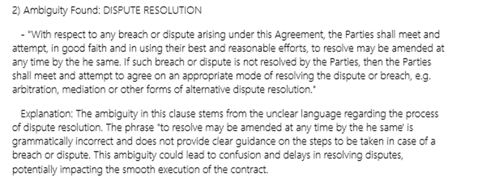 In the arena of legal contracts, clarity and precision are critical. Lawyers, trained in the nuances of legal language, often navigate through complex legal jargon and contractual frameworks with ease. This legal-speak, while efficient for the trained eye, harbors its own set of challenges, especially when it comes to detecting ambiguity. Ambiguity in legal documents can lead to disputes, protracted litigation, and unintended outcomes, making its identification and resolution a critical skill in legal practice. However, despite rigorous training, lawyers without a strong academic grasp of the English language itself may find detecting such ambiguities particularly challenging. Lets look at a few examples from one such contract.