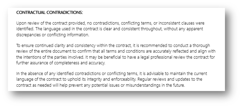 Contracts are fundamental in establishing clear terms and conditions between parties in various transactions and agreements. However, within these legal documents, contradictions can arise, creating confusion and potential conflicts. Contractual contradictions, much like ambiguities, can have serious consequences for both clients and vendors. This paper delves into the intricacies of contractual contradictions, emphasizing the importance of a comprehensive focus on the contract in its entirety to avoid detrimental outcomes.