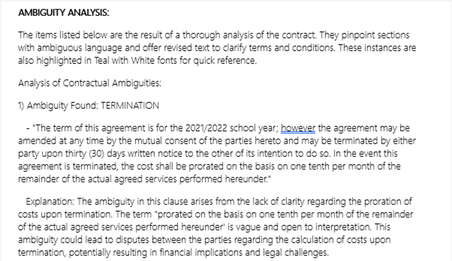 In the arena of legal contracts, clarity and precision are critical. Lawyers, trained in the nuances of legal language, often navigate through complex legal jargon and contractual frameworks with ease. This legal-speak, while efficient for the trained eye, harbors its own set of challenges, especially when it comes to detecting ambiguity. Ambiguity in legal documents can lead to disputes, protracted litigation, and unintended outcomes, making its identification and resolution a critical skill in legal practice. However, despite rigorous training, lawyers without a strong academic grasp of the English language itself may find detecting such ambiguities particularly challenging. Lets look at a few examples from one such contract.