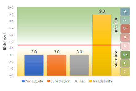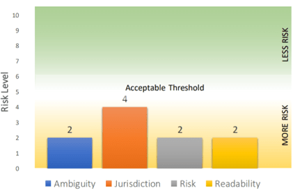 The figures below depict a subset of our comprehensive dataset, illustrating the general trends and notable patterns observed across these dimensions. The first set of charts provides a detailed breakdown of contract scores based on four critical criteria: Ambiguity, Jurisdiction, Risk, and Readability. These criteria are pivotal in understanding the effectiveness and enforceability of contractual agreements. Each chart is representative of broader patterns identified through our analysis, offering insights into the prevalence of certain contract characteristics that may influence the parties’ understanding and legal standings.