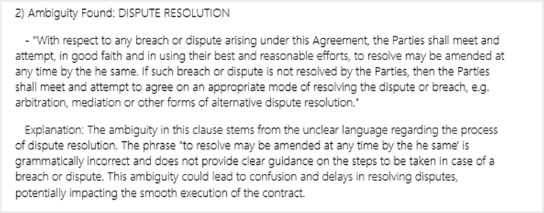 Ambiguous terms in contracts often lead to disputes, as parties may interpret the same clauses differently. This divergence in understanding can result in prolonged negotiations, delays in project execution, and even litigation. The lack of clarity in legal language creates a fertile ground for misunderstandings, where each party believes their interpretation is correct, only for these differences to be resolved in court, often at great expense and with uncertain outcomes. STRATETGEN ANALYTICS’s analysis highlights these ambiguities and provides recommendations to resolve them before they become contentious issues.
