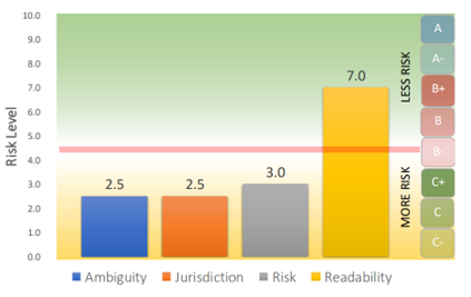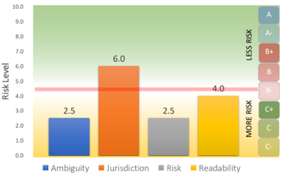 The figures below depict a subset of our comprehensive dataset, illustrating the general trends and notable patterns observed across these dimensions. The first set of charts provides a detailed breakdown of contract scores based on four critical criteria: Ambiguity, Jurisdiction, Risk, and Readability. These criteria are pivotal in understanding the effectiveness and enforceability of contractual agreements. Each chart is representative of broader patterns identified through our analysis, offering insights into the prevalence of certain contract characteristics that may influence the parties’ understanding and legal standings.