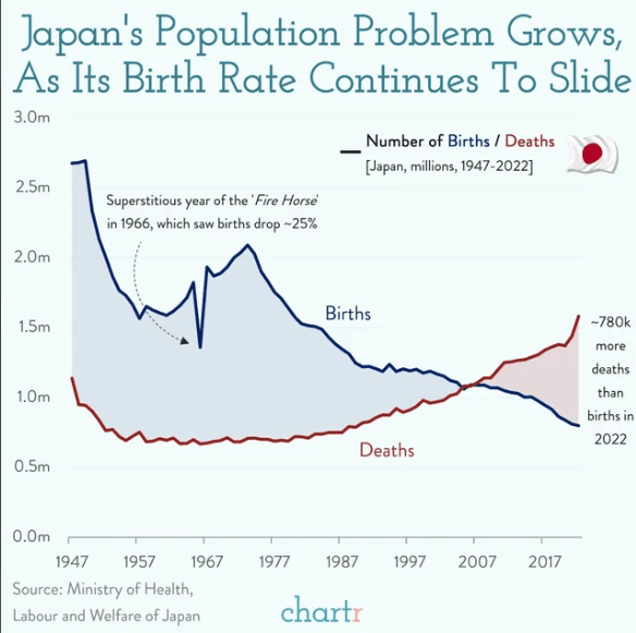 The following chart vividly illustrates Japan’s deepening demographic crisis, characterized by a sharp decline in birth rates and a rising death rate over the past several decades. From the late 1940s through the 1960s, Japan experienced a significant drop in the number of births, which was particularly pronounced during the superstitious “Fire Horse” year of 1966, where births plummeted by around 25%. This period marked the beginning of a long-term trend of declining births.