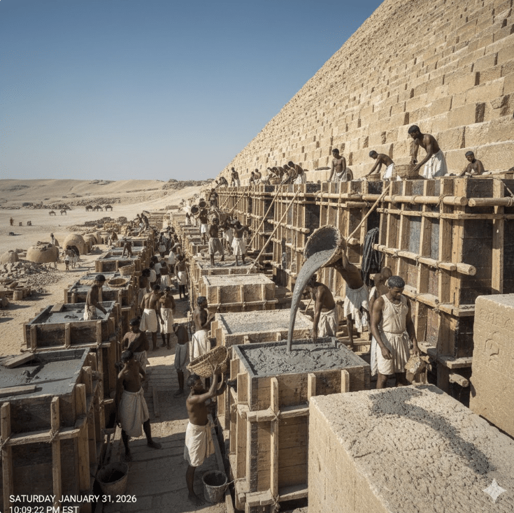 My theory starts with geopolymers—a fancy term for a concrete-like mixture made from natural materials. Imagine dissolving soft limestone (rich in kaolinite clay) from the Nile or local quarries into a slurry, adding lime, natron (the salt used in mummification), and perhaps other binders. Pour this mix into wooden moulds directly on-site, let it harden through a chemical reaction, and you’ve got a “stone” block that weighs tons but was never lifted or transported. Once dried, fine-tune the surface with chisels to mimic tool marks, sedimentary layers, or even fossils, making it indistinguishable from quarried rock. The result? Perfect corners, seamless fits with gaps as tiny as 0.02 inches, and no need for the backbreaking haul of 2.5 million blocks for the Great Pyramid.
